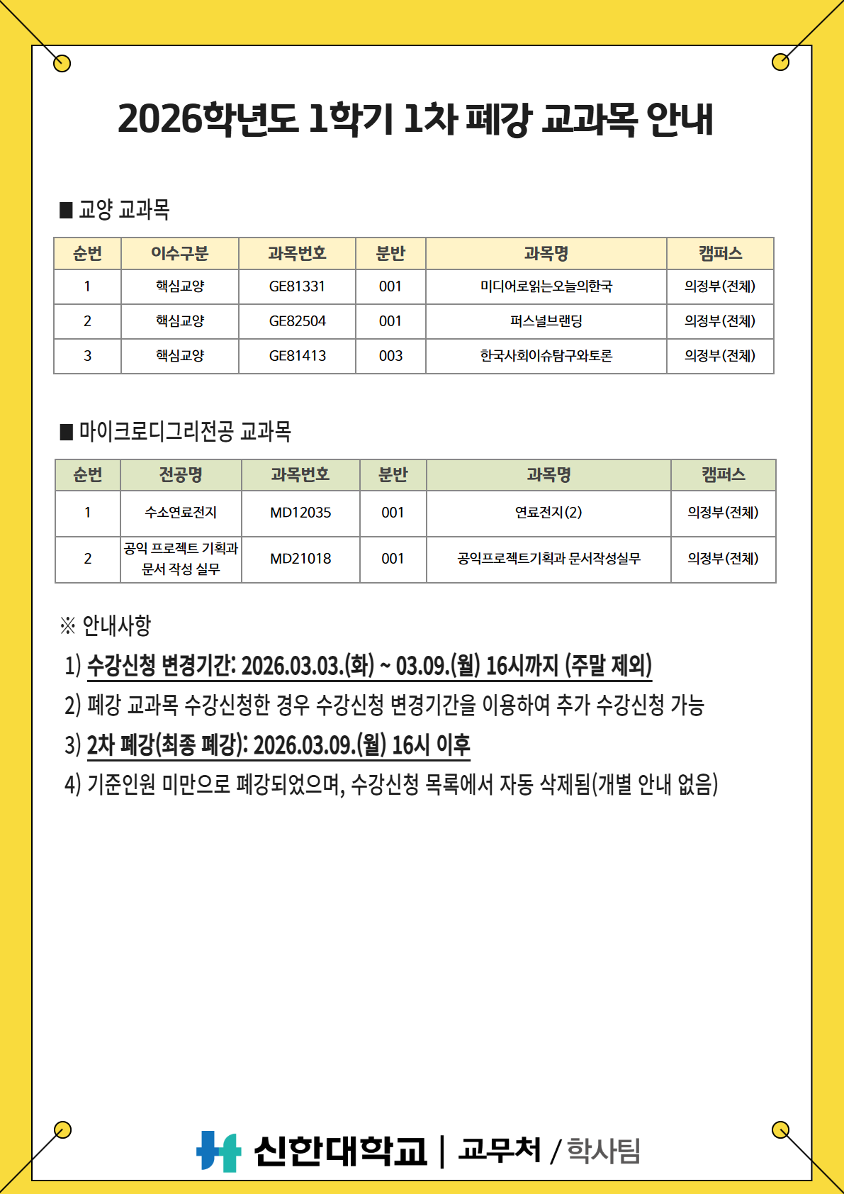 [학사팀/수업] 2026학년도 1학기 1차 폐강 교과목 안내